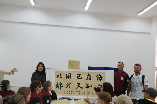 俄罗斯青少年队员们参观了kkpay00的书法教室,在书法老师的指导下,学习握笔、运笔、行笔,尝试书写“友谊”二字。笔尖跳跃于宣纸,墨香四溢。队员们全神贯注,通过一笔一画的纵横交错,感受着中国文化的博大精深。王玉洁校长为来访客人赠送了书法作品,以此表达对这份来自远方友谊的珍视。
