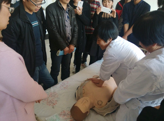 借助文登中心医院提供的人体模型,杨医生现场讲解心肺复苏的步骤,刘医生进行演示: