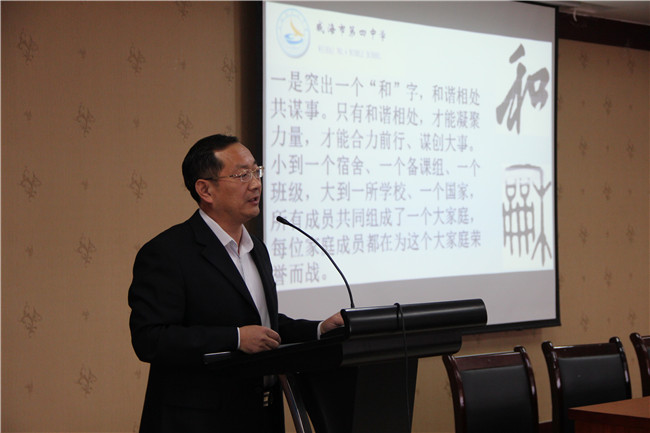 一是突出一个“和”字,和谐相处共谋事。希望全校上下和谐相处、健康快乐,心往一处想、劲往一处使,共同为四中的发展献策出力。要加强沟通与协商,对内一条心、对外无杂音,有话说在当面,背后不搞小动作。要把幸福生活往幸福里过,把心放宽一点,健康多一点,快乐多一点,特别是不要拿别人的缺点来惩罚自己。要鼓励老师和学生充满阳光,将礼貌用语挂在嘴上,相互尊重、笑口常开。学校将建立笑脸墙,让师生们天天看到自己的笑脸,快乐地工作和学习。