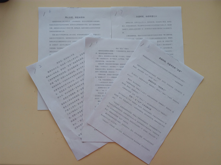 2016年3月7日上午第三节课,科研处邀请我校倪红霞、张莉莉、周洪香、刘淑英、杨付磊5位教师参与《山东教育》教育随笔征文评选活动。此次邀请的5位教师都曾在《威海教育》上发表过文章,熟知发表文章的内容和要求。本着公平、公正的原则,科研处将上交的14篇文章去掉作者姓名,重新排序,5位评委按照征文要求评选出6篇优秀文章,最终《用心去爱,用爱来等待》 《再回首,依旧初心不改》 《某些时候,你是学生的“法官”》 《创造时机,助燃希望之火》 《装在“谎言”里的人》等5篇文章得票数最高,获得推荐资格。