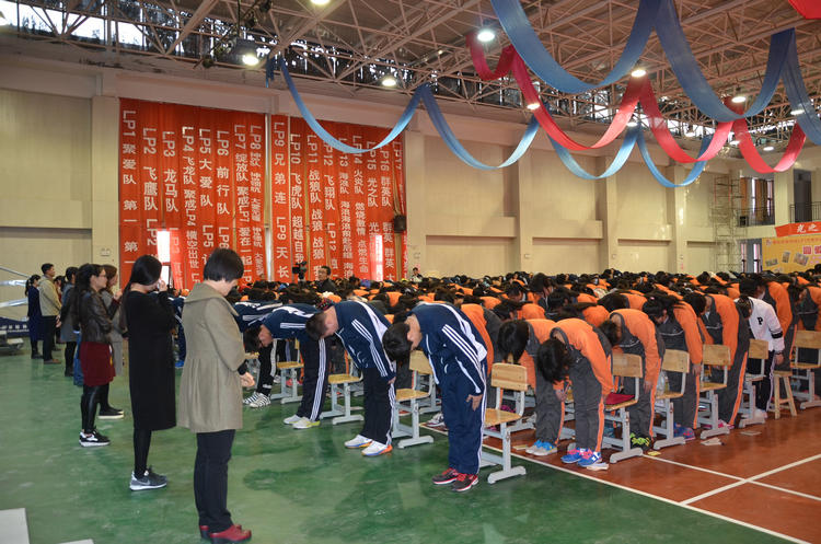 随后活动进入互动环节,伴随着优美的乐曲声中,刘老师引领大家回忆过往,走过成长的点点滴滴。同学们以放松的姿态,闭上眼睛,认真品味回忆带给自己的感动。其中闪现出了父母无私的爱、老师的谆谆教导,往日历历在目,让在场的师生们感慨万千,热泪盈眶,心灵受到了深深的震撼。所有的班主任站在自己班队伍的前面,面对着同学们,在音乐声中,在刘老师催人泪下的话语中,所有的同学向自己的老师鞠躬,并一一走上向拥抱自己的老师。