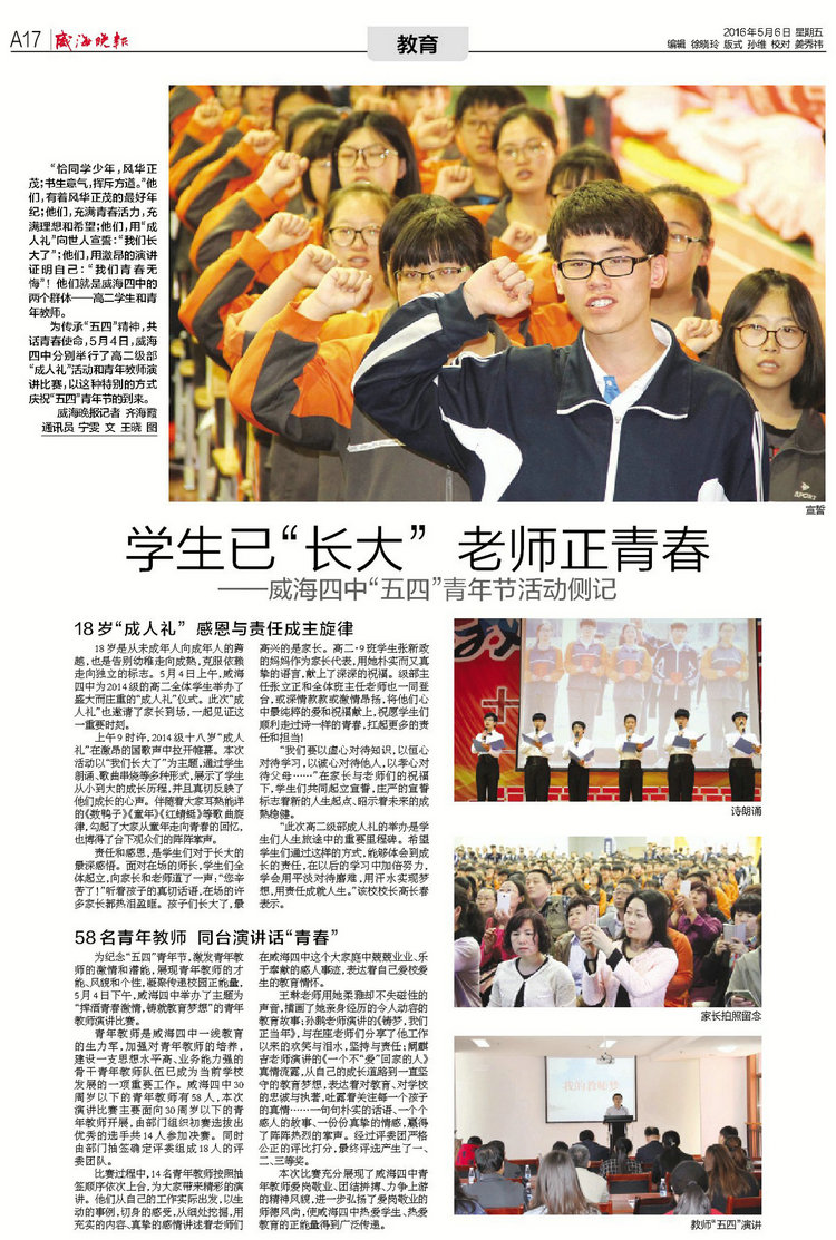 5月6日,《威海晚报》A17版“教育”板块专题报道了我校“五四”青年节活动,题目为《学生已“长大” 老师正青春》。以下是报道具体内容。