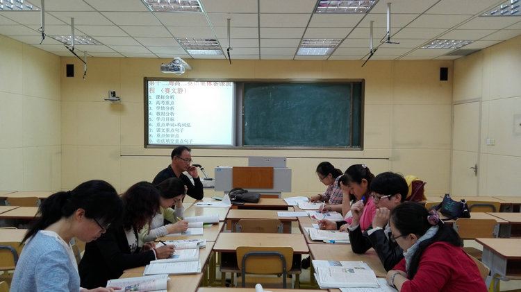 赛文静老师首先和大家一起,立足于课标八级目标要求、高考重点、学情分析和教材分析,确定了本单元的整体教学目标。然后,赛文静老师重点阐述了主体课文的授课重点和导学案的设置及练习重点,备课组全体成员参与讨论、补充。探讨的重点主要围绕教学重难点的授课方法及练习与检测中出现的问题的解决办法展开,旨在通过教学提高学生语言知识及语言技能。