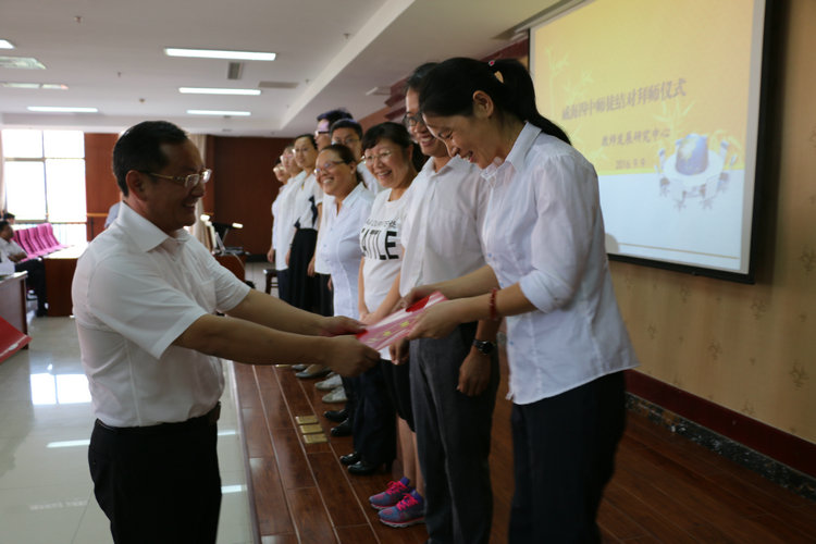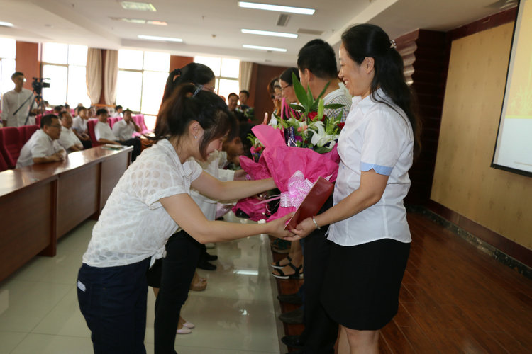 会上还组织进行了青年教师拜师仪式。近年,我校青年教师明显增多,为学校发展注入新的活力,促进了教育教学质量的进一步提高。基于青年教师参加工作时间短,教学上存在一些不足的现状,为使他们尽快提高教学素质和业务水平,我校选聘了有着丰富教学实践经验和突出业绩的优秀老师作为新教师的指导教师。由高长春校长向老教师们颁发指导教师聘书,青年教师向老教师献花拥抱,并合影留念,新老教师拜师成功。新老教师代表签订拜师协议,他们各自都有自己的明确职责,互相学习、互相促进,取长补短、共同提高,真正实现“老带新、新促老”。