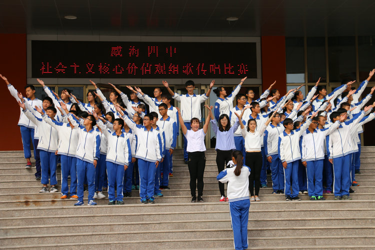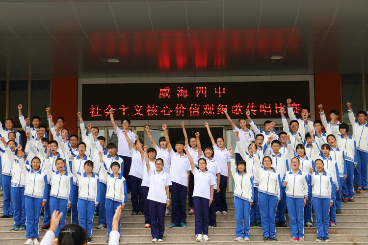“幸福少年——社会主义核心价值观组歌”是由威海市委宣传部会同中国音乐家协会联合制作,包含“富强歌”、“民主歌”、“文明歌”、“和谐歌”、“自由歌”、“平等歌”、“公正歌”、“法治歌”、“爱国歌”、“敬业歌”、“诚信歌”、“友善歌”、“幸福少年”、“快乐少年”14首歌曲。组歌主题鲜明、振奋人心、通俗易懂、旋律优美。我校积极利用各种形式推送组歌,让24字核心价值观唱响校园、随歌入心,成为学生心灵和行动的守护者。
