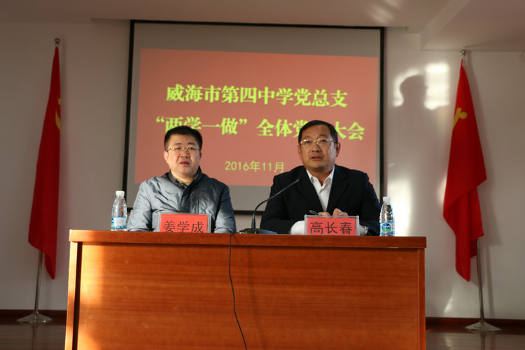 同时,姜学成同志还从习近平总书记提出的好干部的“信念坚定、为民服务、勤政务实、敢于担当、清正廉洁”标准角度出发,深刻解读了“两学一做”重在务实求效,落实在行动上。尤其要以“读、听、写、记、悟”的方法不断端正态度,加强学习,多听学生和家的声音,学以致用、学做结合、知行合一,争做合格党员;在大是大非面前,做品行合一的共产党员,恪守党规党纪,在政治、廉政、组织、工作与生活上,忠诚党的教育事业,在红包、教辅、有偿家教等方面,做有规矩、有纪律的合格党员;从对教育的态度、对工作的态度、对权力的态度、对自己的态度上,不断严格要求自己,不断带动身边教职员工为威海教育事业的更高更好发展贡献新的力量。