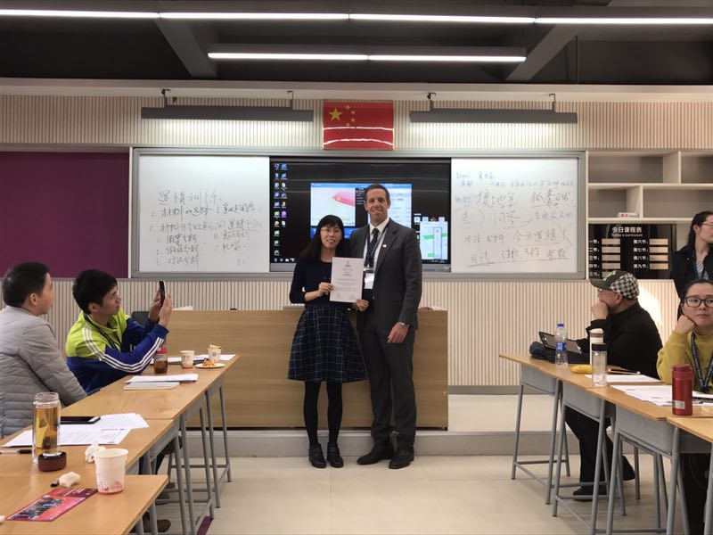 图为艾文豪教学主管Evan先生为老师颁发优秀证书