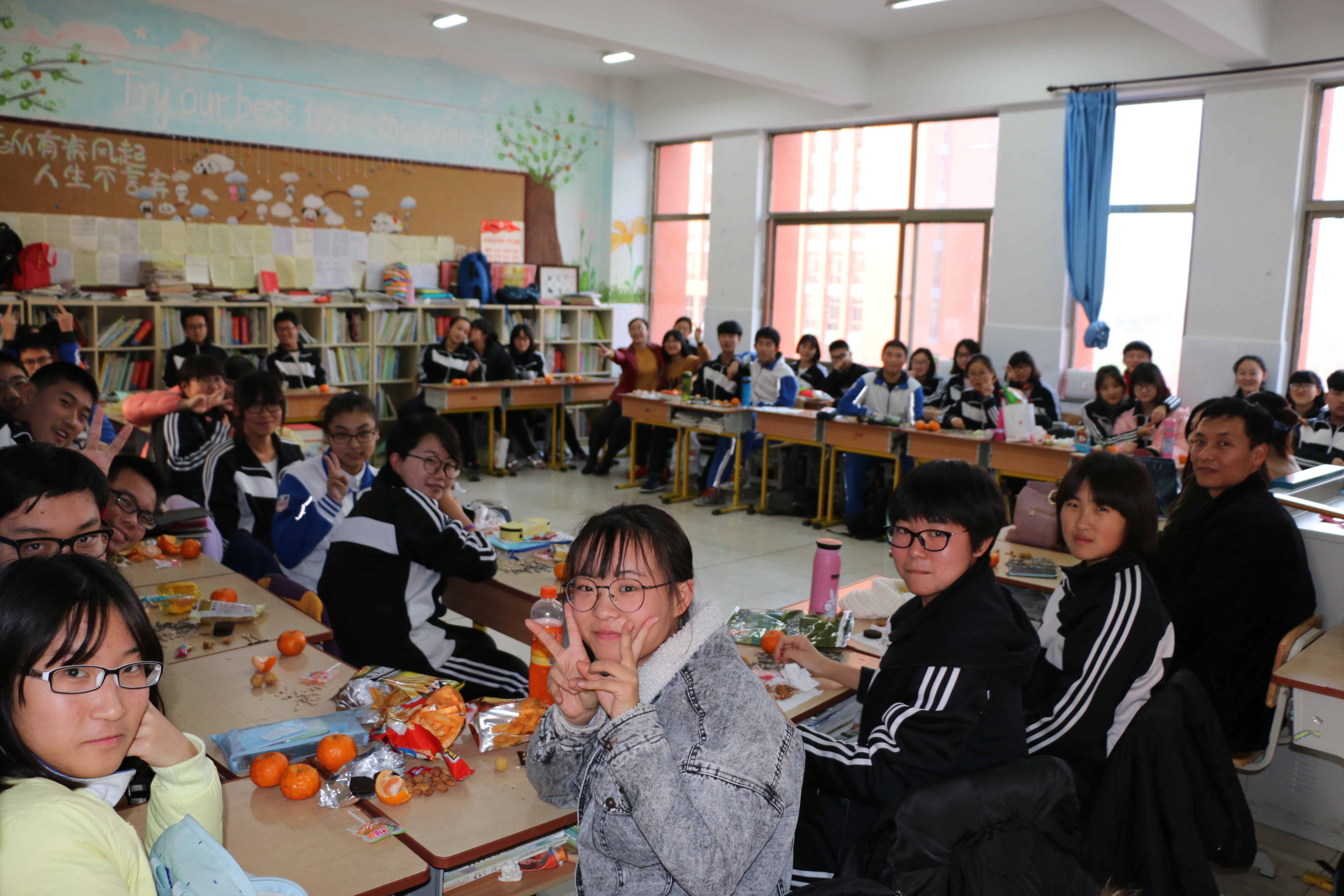 图为我校高一13班师生与家长一起召开元旦联欢会