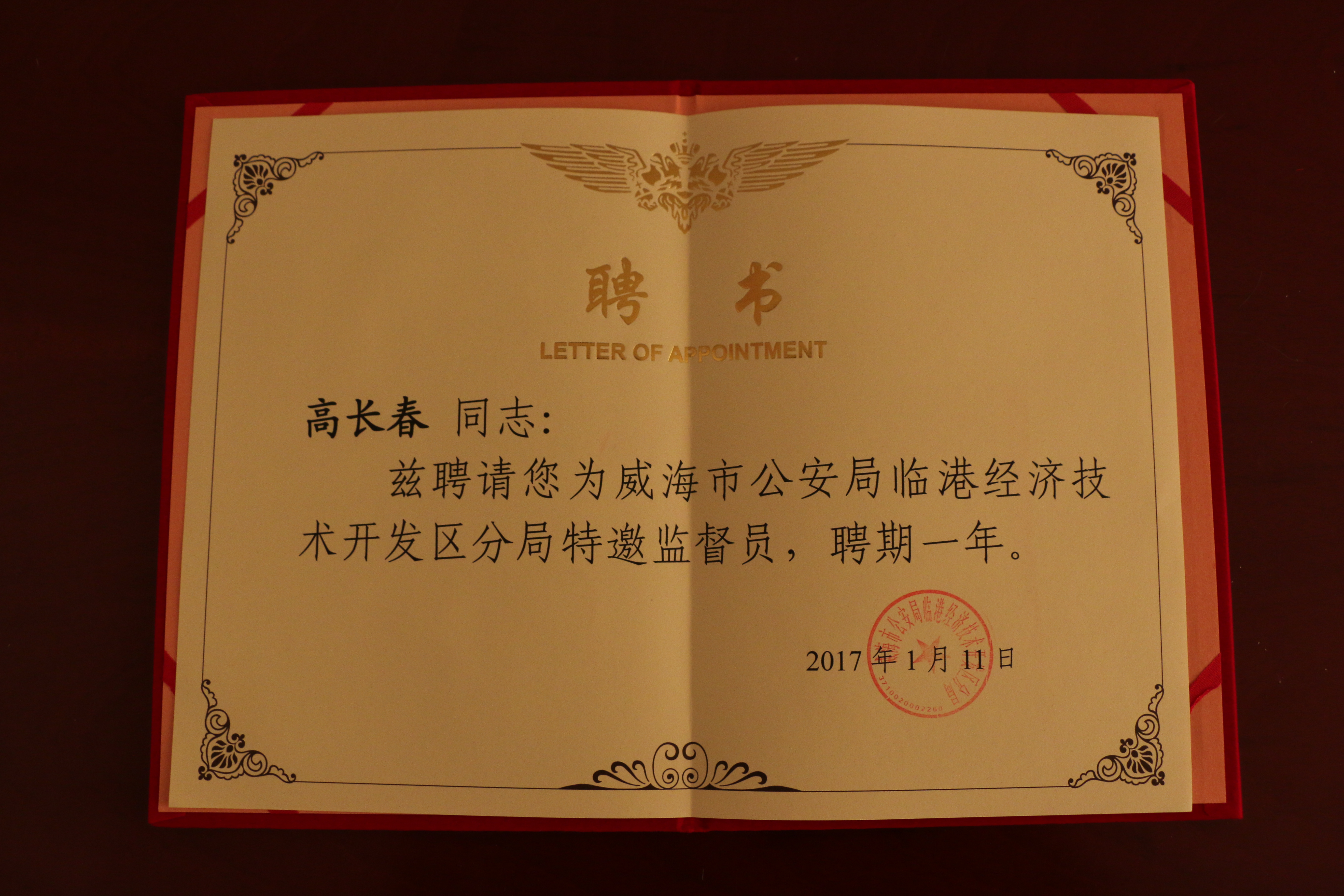 图为我校高长春校长被聘为市公安局临港区分局特邀监督员聘书