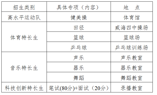 健美操高水平运动队员招生对象为中心城区范围内的应届初中毕业生(包括环翠区、高区、经区、临港区);其他体育、音乐、科技创新特长生对象为草庙子镇、汪疃镇、苘山镇、环翠区城区昆明路以北、高技区城区世昌大道以北、孙家疃镇及高技区城区世昌大道以南、羊亭镇、张村镇、初村镇的应届初中毕业生。