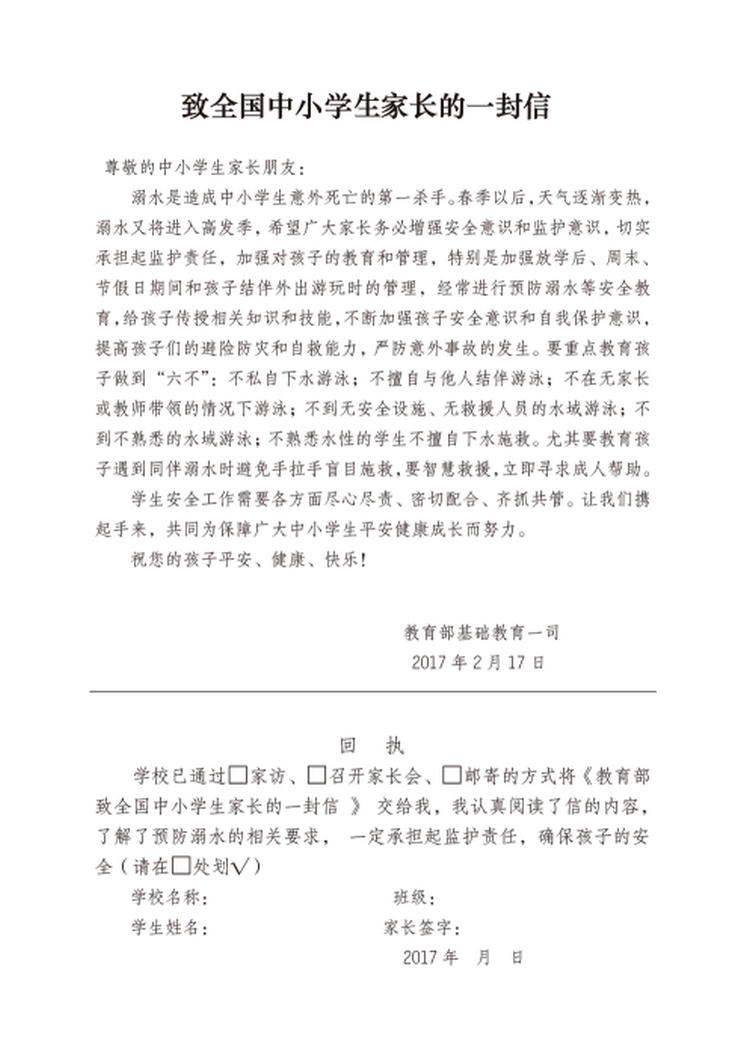 为进一步加强taptap体育手机客户端教育,帮助广大学生增强防溺水安全意识,掌握防溺水知识技能,切实做好我校学生防溺水安全教育工作,各班级于3月27日上午第三节课召开专题班会,组织学生统一观看了防溺水安全教育专题片,同时向全体家长印发了教育部基础教育一司下达的《致全国中小学生家长的一封信》,让每一位学生和家长意识到安全的重要、生命的可贵!