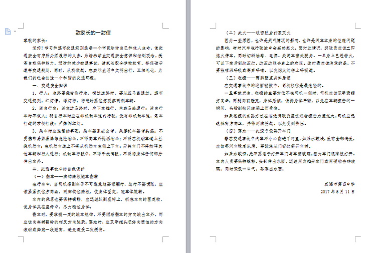 四是通过致家长的一封信的形式,向家长进行安全交通、防灾减灾的宣传,特别是不租用无营运资质的车辆接送学生上下学,不乘坐三轮车、农用货车、摩的等具有安全隐患的车辆等,告诫学生家长树立安全交通意识。