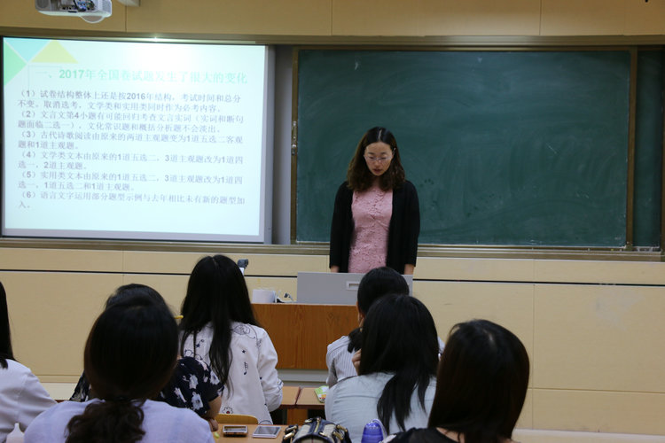 图为高一文科备考会上语文组金秀娟老师进行交流