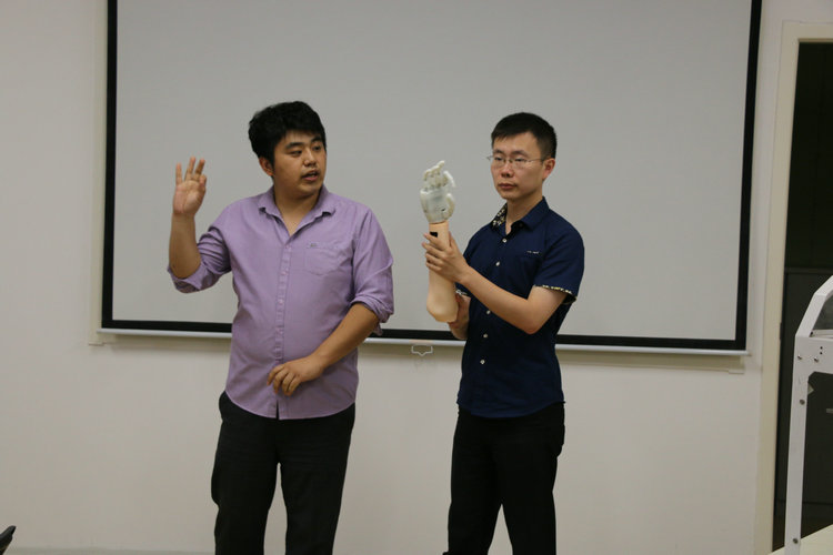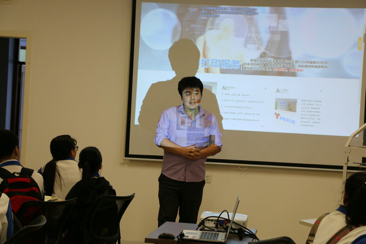 3D打印项目组成员现场给学生们展示了一个简单的打印杯子的制作过程,并展示公司的核心产品——3D打印假肢