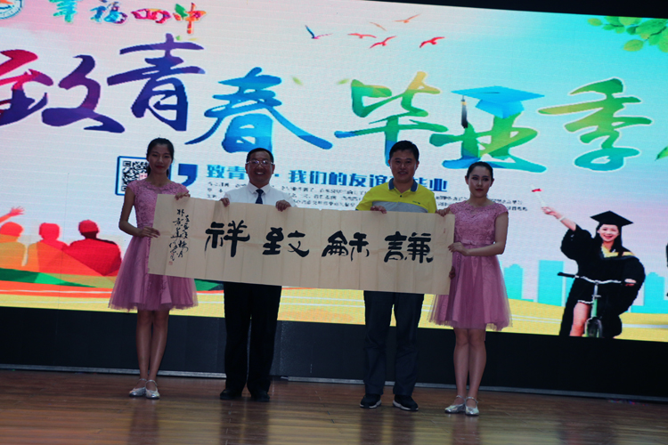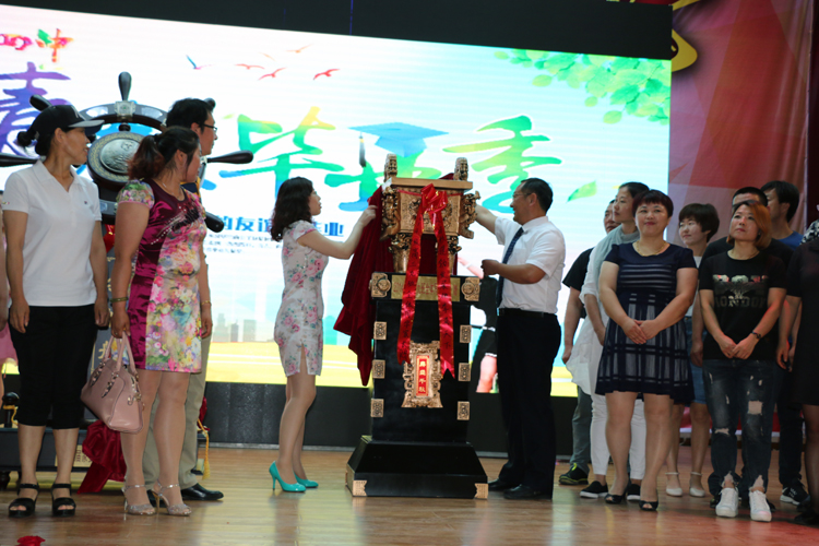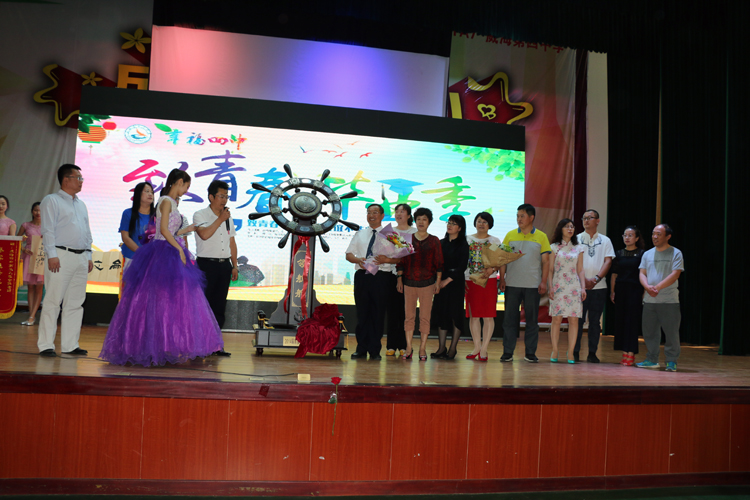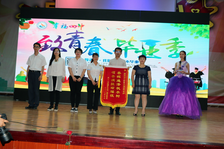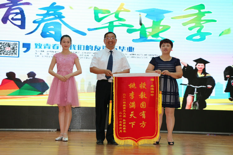 不仅仅是每一位学生对四中有着深厚的感情,家长们也对四中怀着最崇高的敬意。2014级家长代表薄振杰先生深情地表达了家长们对孩子的关爱与祝福,并代表所有毕业生家长对学校和老师们的辛勤培育表达了由衷的感谢。2014级家长委员会向学校赠送了寓意为乘风破浪的礼品“领航舵”;2014级9班全体家长向学校赠送了永远昌盛的礼品“鼎盛千秋”;2014级3班高湘杰家长高军伟先生向学校赠送书法“谦和致祥”;2014级9班张新政家长王萍女士为高三9班全体教师送来了锦旗“硕果满挂琼瑶枝、春晖遍泽桃李树”,为学校送来锦旗“授教固有方,桃李满天下”。一份份饱含感激之情的礼物见证着幸福四中稳健的成长,也预示着幸福四中更加灿烂辉煌的未来。