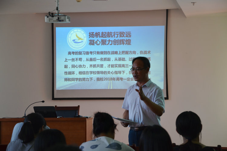 随后,于海生主任对高三新学期的备考做出具体指导,于主任指出:一、明确奋斗目标,高三这一年要突出“紧”,要求“紧中有严、紧中有放、紧中有序”,既要让学生紧起来、静下心来,又要让学生动起来、放开手脚。二、研究高考动向,制定复习计划,高三是一个整体,要紧密的团结在一起,共同帮助高三每一个学生健康的成长实现人生的理想。各备课组重视对样卷和高考卷的研究,把握高考命题要求和高考命题方向。高三各备课组紧紧围绕高考“立德树人、服务选材、引导教学”的核心功能,以基础性、综合性、应用性、创新性为考查要求”的高考评价体系框架为指引,认真研究制订高三备考复习计划。三、着眼教学常规,聚焦常态课堂。通过抓有效备课、有效课堂、有效作业、有效考试、有效辅导,整体建构有效教学链条,提高高三复习的质量和效率。四、做好单元检测、月考、统考、模拟高考测试。积极应对一轮统考、二轮统考、高考,通过学科沙龙分享备课组的智慧和提高教师的教研水平,最终形成众志成城。五、注重精神鼓励,激发学习斗志。全体教师要形成强大的合力,用饱满的正能量感召学生,要用爱心和关心,点燃学生的青春热血和激情,激发每一位学生的昂扬斗志,鼓励学生建立自信心,养成良好的行为习惯,进而战胜自己、增强动力、转化为理想的学习和考试成绩,共创2018届高考的新奇迹。六、加强班主任管理,稳步推进高三备考工作。建立班级量化评估制度,加强班主任培训学习,以人为本,实行人性化管理。
