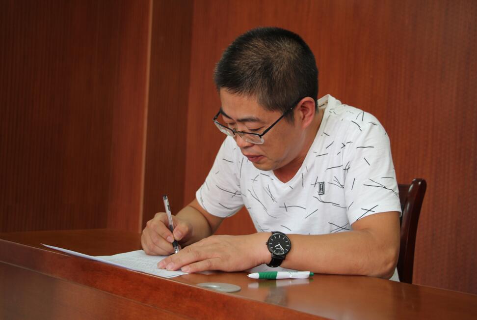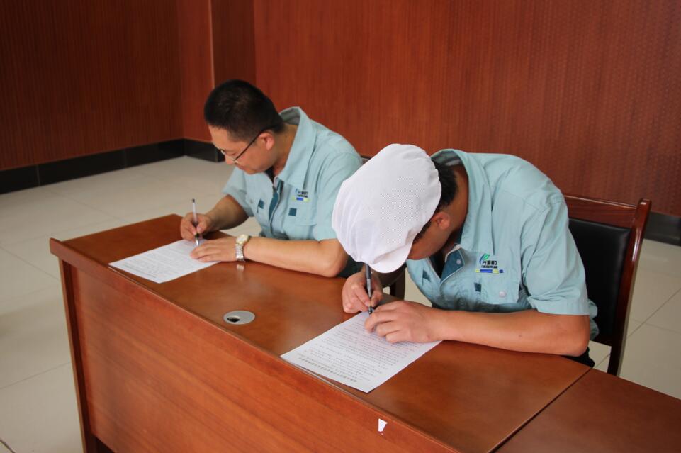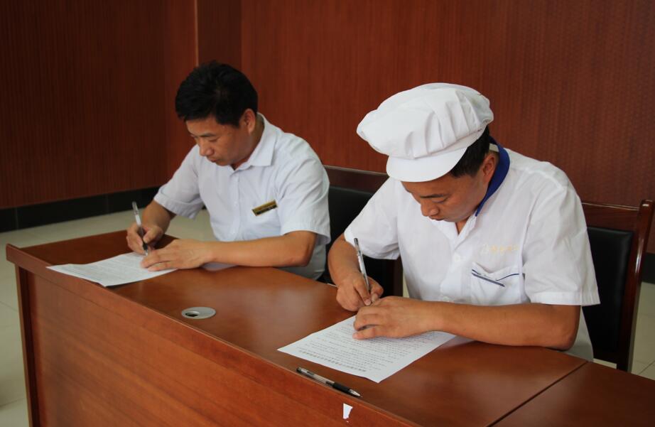 图为我校一楼餐厅兴顺餐饮经理与厨师长签订承诺书