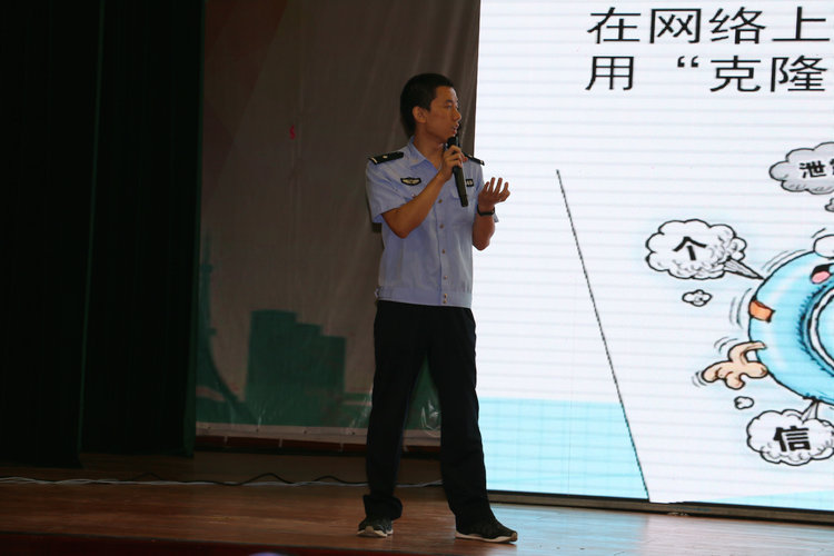张警官首先为大家介绍了如何保护好个人隐私。如在设置密码时,他建议大家尽量使用字母数字组合的安全强度高的密码;在遇到免费WiFi时不要着急连接;也不要随便扫描二维码等。随后张警官就常见的网络诈骗手段以及如何防范网络诈骗方面做了详细讲解。他指出网络购物诈骗经常以线下交易、拒绝安全支付等方式进行,不法分子还利用假冒的银行网站窃取个人密码进行犯罪活动。他指出为防止网络诈骗,一定要保护好个人隐私,不要贪小便宜。张警官还倡导同学们不要沉迷于网络游戏,并介绍了沉迷网络游戏带来的疾病,如光过敏,游戏拇指等。最后张警官倡议同学们遵守全国青少年网络文明公约,诚实友好交流,增强自护意识,浏览有益信息。