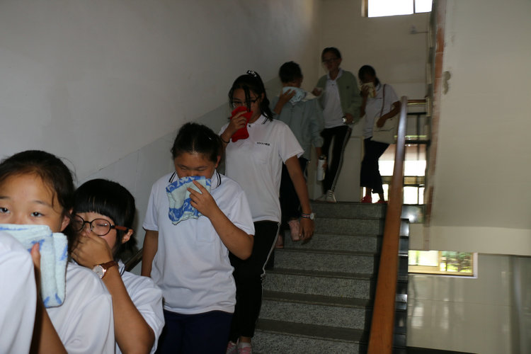随着警报铃声响起,各位老师立即到达指定地点,指导学生快速撤离。全体学生按紧急疏散指挥命令,弯着腰,捂住口鼻,沿着学校指定楼梯通道,迅速有序地疏散到学校开阔的运动场地。到达指定的安全区域后,各班级集合排队清点人数并向上级进行汇报。
