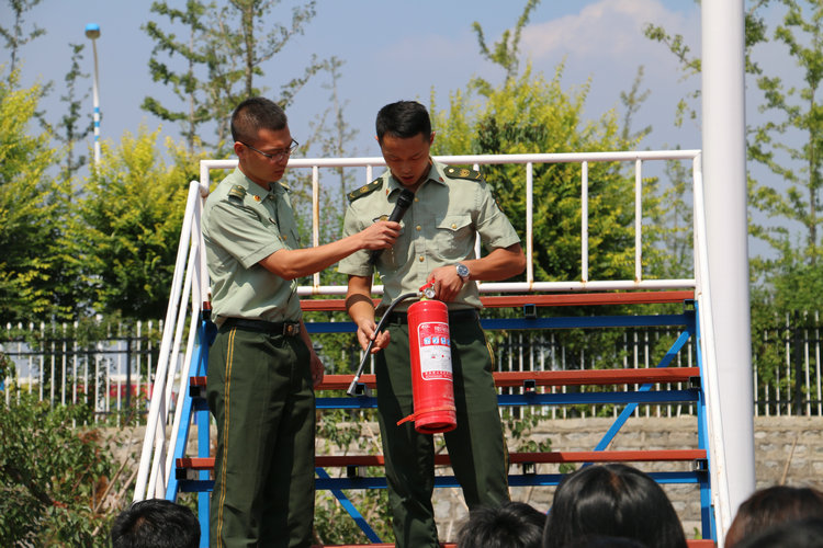 演习完毕后,威海市临港经济开发区消防大队开元中队的警官们给全体2017级师生讲解了干粉灭火器的结构,并讲解了灭火器的使用方法以及注意事项。他们特别指出由于灭火器存放时间长,使用时一定要上下颠倒几下;在使用期间不要一直按压灭火器等。随后警官们现场进行了演示,师生对干粉灭火器的使用进行了演练。