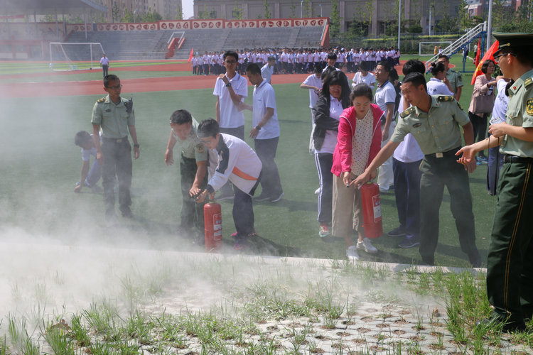 消防警官指导师生正确使用灭火器