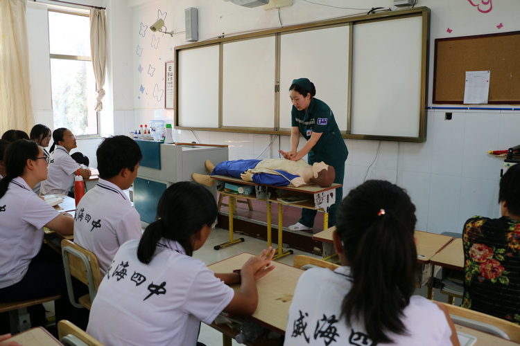 借助文登中心医院提供的人体模型,王医生在讲解心肺复苏的步骤的同时还进行了现场演示。她指出心肺复苏有以下几步: