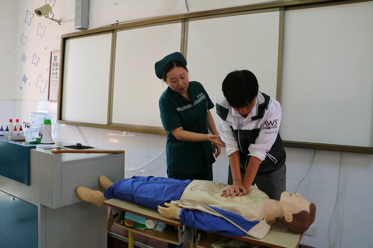 王医生讲解演示后,学生们踊跃地到模型面前进行实战模拟。尽管他们听得很认真,但在实践中还是或多或少的有错误出现。王医生一直在旁边给予耐心地指导和纠正,直到学生们真正掌握了这项急救技能为止。