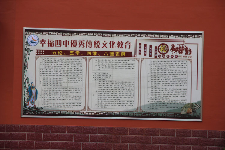 “五伦、五常、四维、八德”是中华民族的传统美德。我校在教学楼两侧及校园宣传栏印上“五伦、五常、四维、八德”的内容,目的就是让同学们学习祖国优秀的传统文化,在日常学习、生活中注意自己的言行、为人、处事,提高自己的道德素养,时时告诫自己“孝、悌、忠、信”的做人原则不能丢弃,“礼、义、廉、耻”的道德观念不能淡忘。