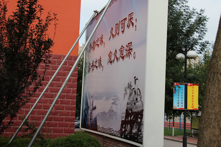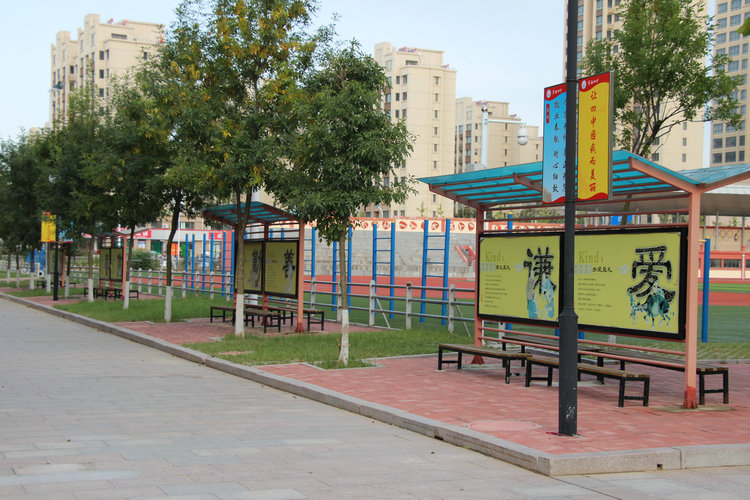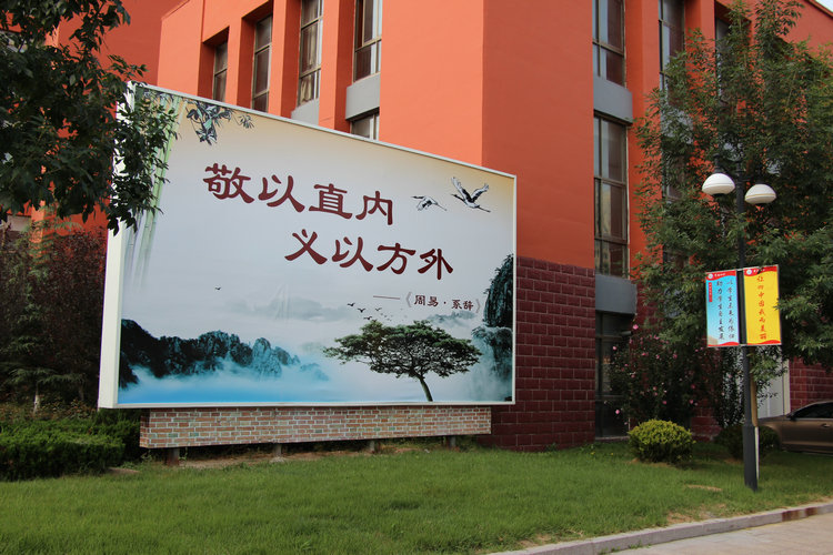 从宿舍区通往教学区的路上,竖立着“敬以直内,义以方外”的牌子。每当路过这里,师生看到上面的字就会提醒自己,要以恭敬慎重的态度作为内心的正直准则,维持内心的真诚;以合乎理义的行为处理外界事务、规范自己的言行。