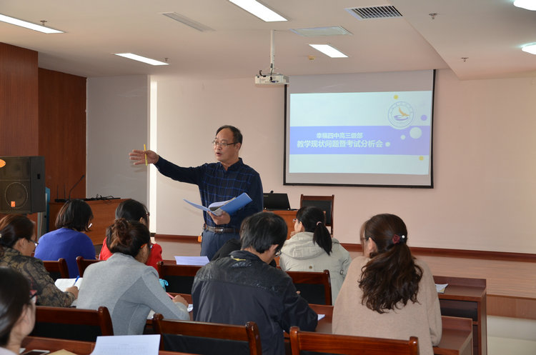于海生主任首先介绍了此次考试的总体概况,用详尽的表格数据对本次考试进行了全面的分析。于主任指出,首先要关注每位学生,提高对学生的要求,要充分了解学情,有足够的耐心,观察学生在课堂的表现并及时提问,找到学生存在的问题并给予及时的指导;其次,要化育人心,让学生既心怀敬畏又乐于与老师沟通;第三,对学生复习情况的检查要到位,一轮复习贵在“严”,要一丝不苟地进行教学训练,培养一丝不苟的学风,要对教学重点及错漏之处,狠打猛敲,使其由“似是而非”上升为“丝毫不差”;第四,要加强与学生的沟通,采取与学生单独聊的方式,铺下身子听学生说,学生只有亲其师才会信其道;第五,要树立学生的信心,多寻找学生的闪光点,不要吝啬赞美的话,要对学生的优点经常提出表扬;第六,要提高自习效率,指导学生制定小计划,用计划来指导自己的自习,同时进行反思与规划,养成日清周结的良好习惯;第七,要加强薄弱学科的学习,回归教材,盯准夯实基础,保障薄弱学科的学习时间;第八,要强化记笔记的习惯,老师要多提醒、多检查、多展示、多注重方法的传授;第九,要注重应试技巧的训练,加大对应试技巧的管束力度,对每一次测试要不断总结与反思,明确得与失,要不断超越自己。