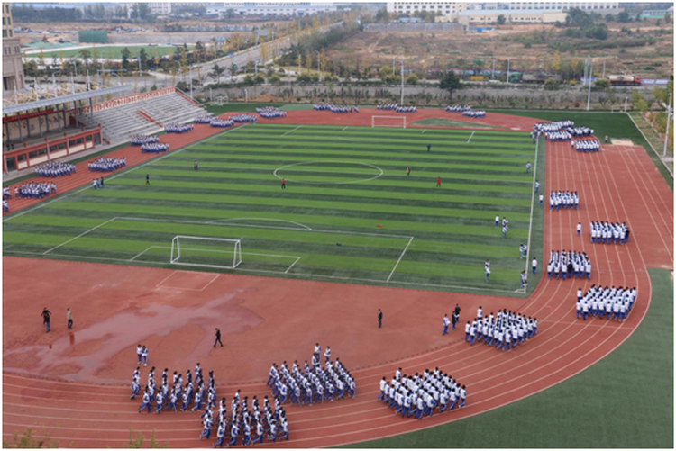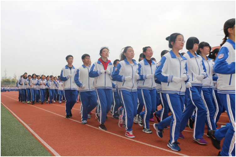 此起彼伏的口号声,整齐划一的步伐声,伴着节奏明快富有动感的背景音乐在校园内回荡。同学们昂首挺胸,精神抖擞,他们穿着统一的校服,踏着一致的步伐,喊着响亮的口号,青春亮丽,阳光十足;各方队旁,班主任老师们一丝不苟地边跟跑边维持队形,场面气势恢弘,蔚为壮观。