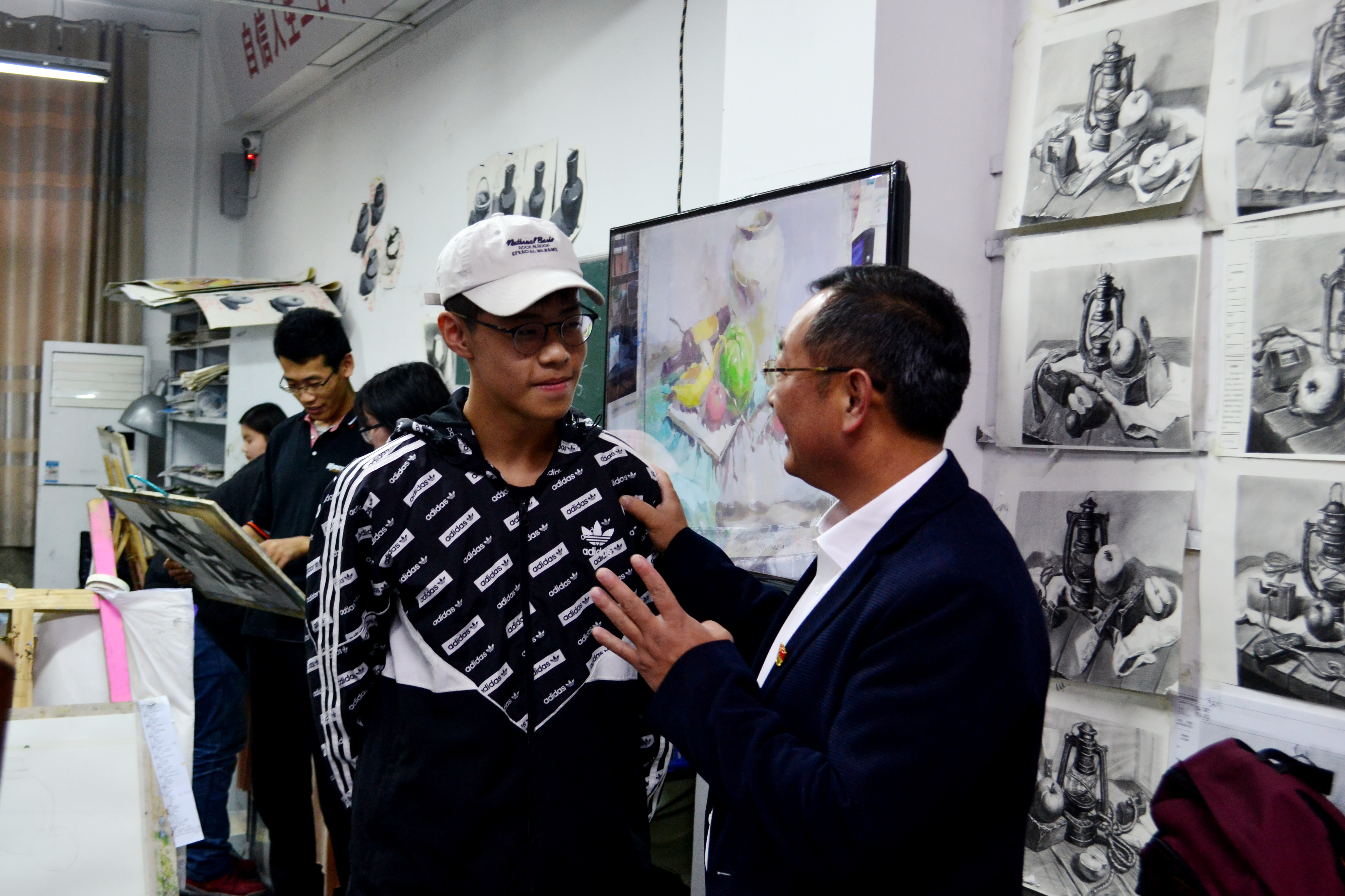 在参观过程中,高校长和邓校长走进教室,走到孩子身边,关心关怀学生学习生活情况。高校长和邓校长对两所学校认真指导、尽心负责的工作态度表示认可和肯定,对高三艺考生专注投入、拼搏奋进的学习状态给予支持和鼓励。
