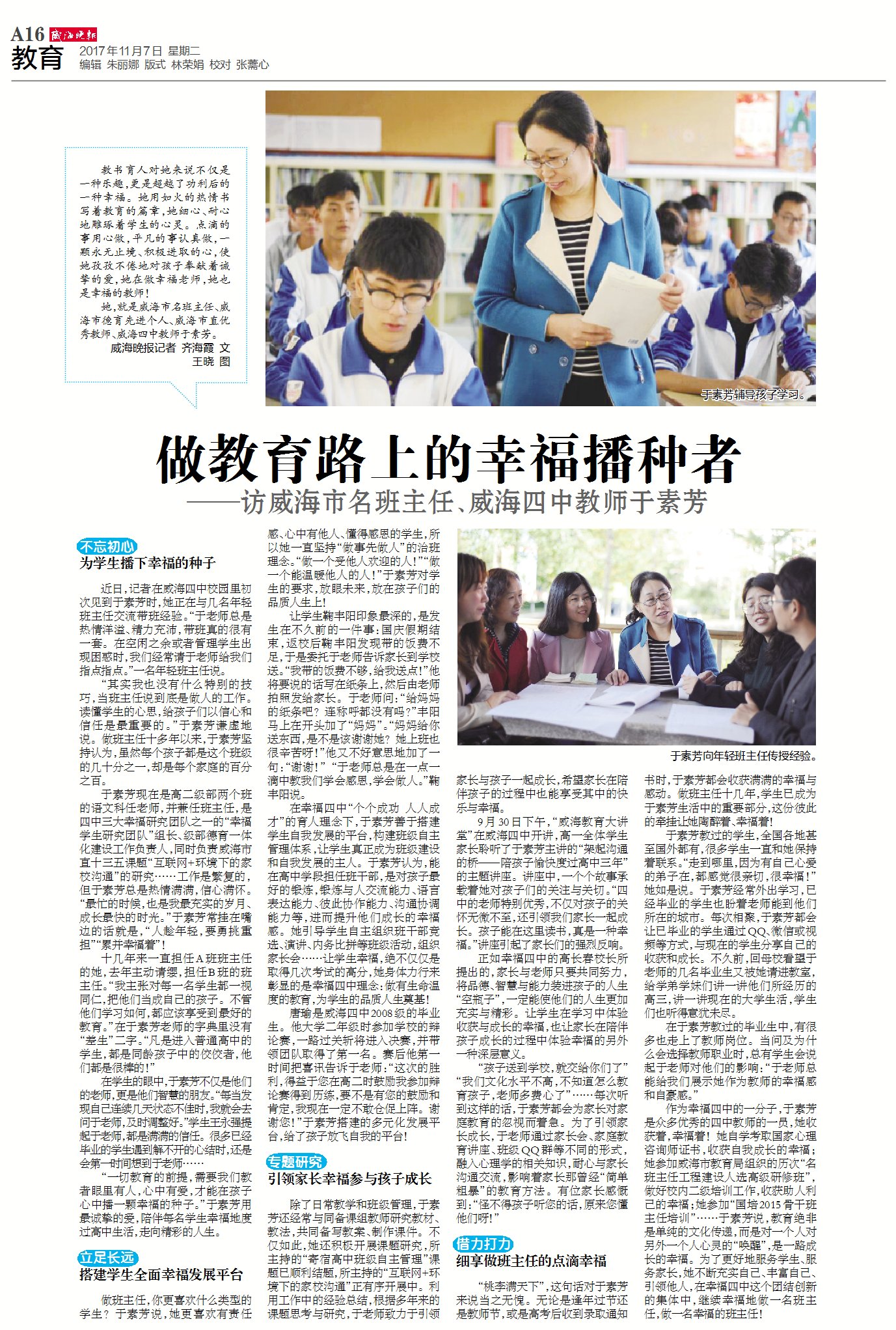 11月7日,《威海晚报》A16版“教育”板块专题报道了我校于素芳老师,题目为《做教育路上的幸福播种者——访威海市名班主任、kkpay00教师于素芳》。以下是报道具体内容。