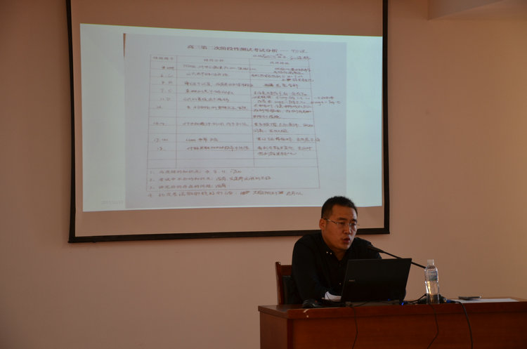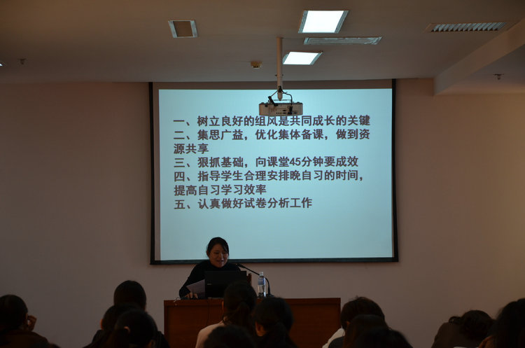 随后,倪红霞老师和孙洪兴老师分别分享了各自备课组和班级管理的经验。倪老师分别从集体备课、上课、作业批改、考试分析四方面详细介绍了生物组的经验,并强调要重视考纲,认真分析研究考纲。孙洪兴老师分别从人和事两方面分享了他的班级管理经验,并介绍了他下一阶段要着重关注的三方面:家校合作、师生情谊及班课合作。