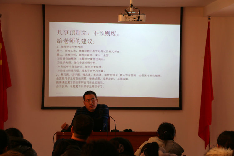 于海生主任结合去年高考录取分数线及自身的教学实践,用详尽的表格数据对本次考试进行了全面的分析。于主任指出:凡事预则立,不预则废,并给老师提出几点建议:一要指导学生分析考试,要转变心态,系统深入全面地分析试卷;二要全面思考学生存在的问题,精选试题,反复滚动,巩固落实,提高课堂复习的效率和自习作业的高效,用板书引领学生高效学习;三要运用思维导图,建立知识体系,不断巩固;四要认真分析考试大纲和考试说明,研究历年的统考题、高考题,每天求实、务实、认真落实;五要开好班级教导会,要关注边缘生,抓两头促中间,充分发挥导师的作用,齐抓共管;六要说错题,通过总结知识点、在说中纠正问题、清晰思路;七要指导青年教师对已经做过的历年高考题精心研究、反思。