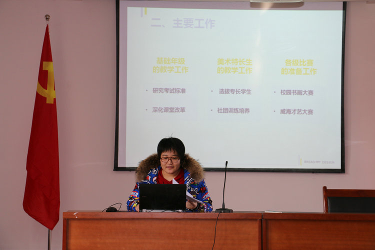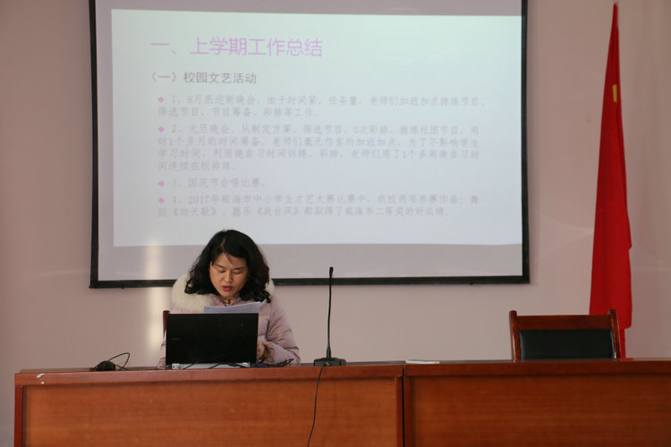 邢燕主任回顾了2017年度体育艺术各项工作情况,对我校在威海市体育联赛、威海市中小学生才艺大赛中取得优异成绩进行了高度的评价,对音体美教师勤奋踏实的精神面貌和工作作风给予了高度赞扬。她提出新高考改革对音体美教师的业务能力提出了更高要求,希望在新学期里每一位艺体老师都能够努力提高自身专业技能,深入挖掘教材,认真抓实自己所分管的项目,独当一面,继续续写我校艺体教师的辉煌。