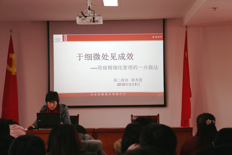 韩秀莲老师为大家做了题为“于细微处见成效”的班级精细化管理的分享报告,她认为,班级精细化管理就是落实管理责任,将管理责任具体化、明确化,做到人人能管理,处处有管理,事事有管理。班主任要从日常管理的细化、自我管理的强化、情感管理的深化等处入手,持之以恒地做下去,一定能够会在班级管理上收到成效。