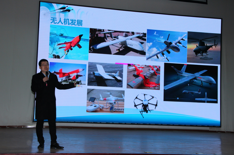 图为杨总在为学生介绍无人机的发展