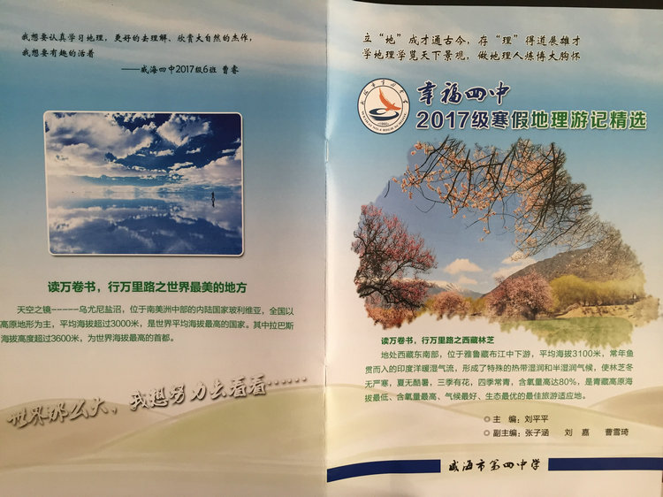 为了引领幸福四中学子认识自然,了解民情,更重要的是形成一种透过现象追溯本源的意识习惯,我校高一地理组的老师们在今年寒假的作业布置上,充分发挥主观能动性,组织学生自主完成一篇游记,既可以“归故乡”,也可以“去远方”,要求“亲历、有爱、体现地理思想”。该活动得到了热爱生活的孩子们的热情回应,最终经老师们反复地阅读推敲,筛选出24篇精品日记,由学校完成了最终排版,将其印刷成册,发到学子手中。
