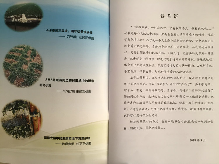 孩子们拿到印有自己文字的书,非常开心。而这次文章没有入选的同学,也纷纷表示以后要更加积极认真的参与到类似的活动中。在接下来的《农业》社会实践中,又有几名同学利用周末短暂的休假时间走向田野,走进麦地,近距离观察了暖温带冬小麦的返青和生长状态,并积累了文字材料和照片,用行动践行了地理核心素养中的“地理实践力”,真正做到了“让大自然成为我们最好的地理实验室,在现实中感受地理”。