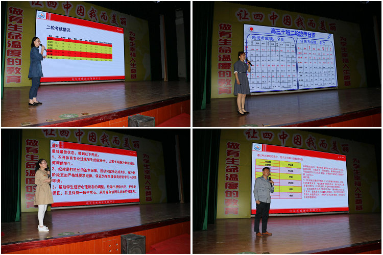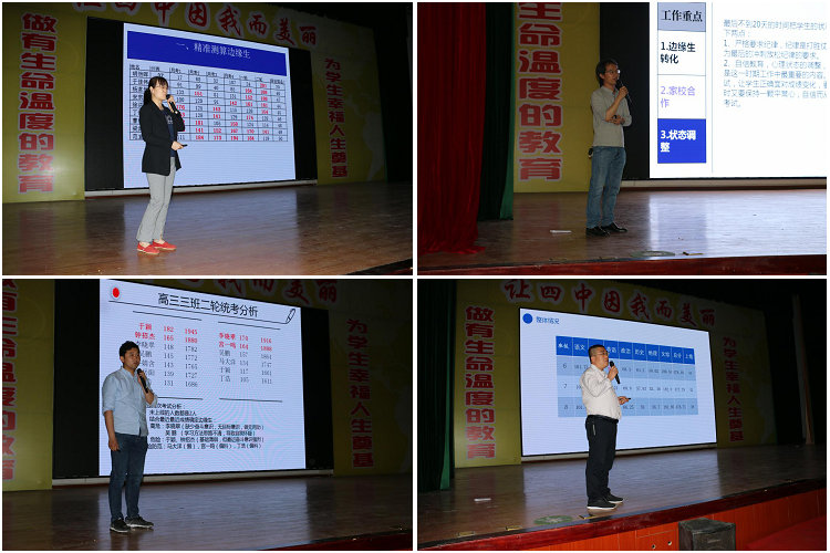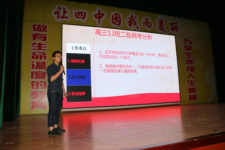 随后,高三级部全体班主任依次上台利用PPT对本班一轮、二轮统考的成绩、过线人数、边缘生等情况进行了对比和分析,并在边缘生转化、家校合作和学生状态调整等方面做出了详细的规划和说明。