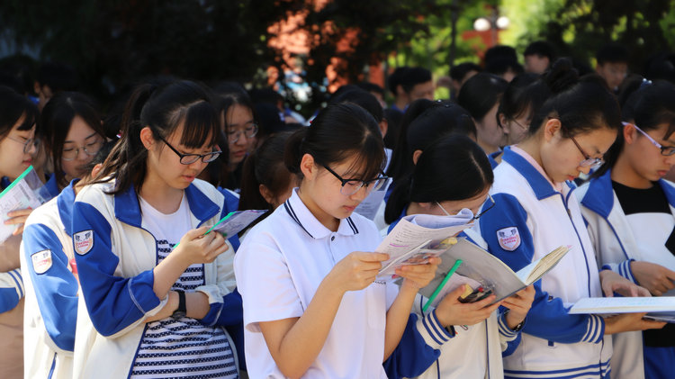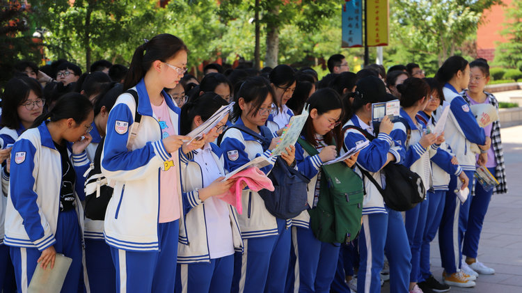 学生们在警戒线外等待入场的同时,抓紧记忆知识要点,不浪费一分一秒
