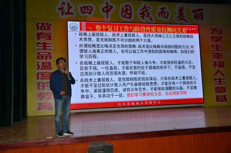 桂主任认为,战略上藐视敌人,战术上重视敌人,是伟大领袖毛主席的战略战术思想,是克敌制胜不可分割的两个方面。对高三而言,整体的复习工作,是高考战役,是战略上的问题;而具体的每个阶段的质量检测,就是一个个具体的战斗,每个战斗打好了,积少成多,我们就取得了最后整个战役的胜利。一轮复习时间紧、任务重,为确保每场战斗都能打胜,桂主任提醒大家要做好以下四点:一是学习要讲程序化,目标、计划、落实三位一体;二是一轮复习首先坚持稳扎稳打原则,夯实基础;三是做好细节,落实好规范;四是忌心浮气躁、急于求成。