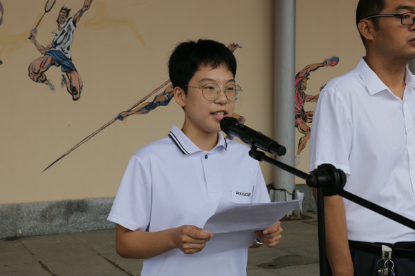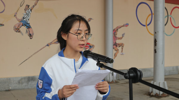 首先,毕业生代表王梓涵和高三8班学生代表王珊珊分别进行了发言。王梓涵同学向大家分享了高中时期的学习经验,脚踏实地,打牢坚实基础,练就过硬本领,学习八佰精神,将满腔爱国之情凝聚为强国力量,与我们的祖国同频共振。王珊珊向同学们发出呼吁,机遇不能错过,青春不容懈怠,凝聚每一份勇气和毅力,追求卓越,追寻梦想,乘风破浪,勇往直前。其次,教师代表唐延文老师表示,在新的学年里,全体教师将不辜负学校领导、家长的希望与信任,开拓进取、积极实践、勤奋工作,向课堂要质量;关注每一个环节,关心每一个学生;在新的学年,牢记初心,坚守情怀,精研业务,用行动让全校师生感受到四中教育工作者的道德与情操。随后,唐延文老师带领全体教师进行宣誓,铿锵有力的誓言在耳畔回荡,激起所有教师内心的共鸣。