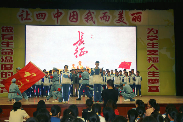 “君不见黄河之水天上来,奔流到海不复回。”一首《将进酒》拉开了比赛的帷幕,将观众带进了一股雄浑豪放的意境之中。吹响冲锋号,八路军握着机关枪,举起红旗奔赴战场,“头可断,血可流,我们的红旗不能倒!”“为了新中国,同志们,给我顶住,给我顶住!”……一幕幕的情景剧扣住了所有师生的心弦,仿佛置身于红军浴血奋战、保家卫国的战场上,一首慷慨激昂的《七律长征》点燃了同学们的爱国心,“红军不怕远征难,万水千山只等闲。”感受到了长征胜利时战士们的喜悦。“商女不知亡国恨”,观众被舞台上的表演吸引,一个身穿旗袍的女子独自跳舞,却不知她身处的国家已经灭亡,而后朗诵者高呼:“新中国在中国共产党的领导下站起来了!”掌声雷鸣,表达了师生强烈的民族自豪感。我和我的祖国共成长,同命运……学生高歌《我爱我的祖国》,让比赛进入了另一个高潮
