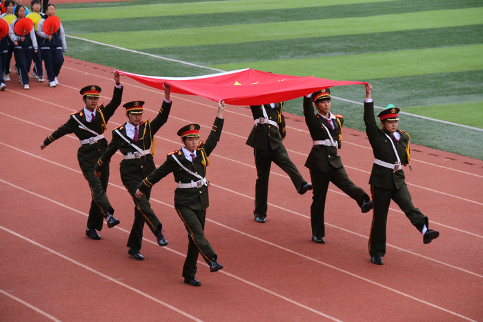 入场式结束后,举行了庄严的升旗仪式,伴随着雄壮的国歌乐曲,五星红旗冉冉升起。随后,张华超副校长致开幕词,对辛勤筹备本届运动会的体育组等工作人员表示感谢,对各位运动员和裁判员致以亲切问候。他强调了校运会对于学校教育教学以及学生身心发展的意义,并希望全体裁判员公正裁决、严守规程、热情服务,希望全体教师坚守岗位、忠于职守、保障安全,希望全体师生把本届运动会开成一次“安全、文明、拼搏、奋进”的大会,开成一次运动成绩和精神文明双丰收的大会。