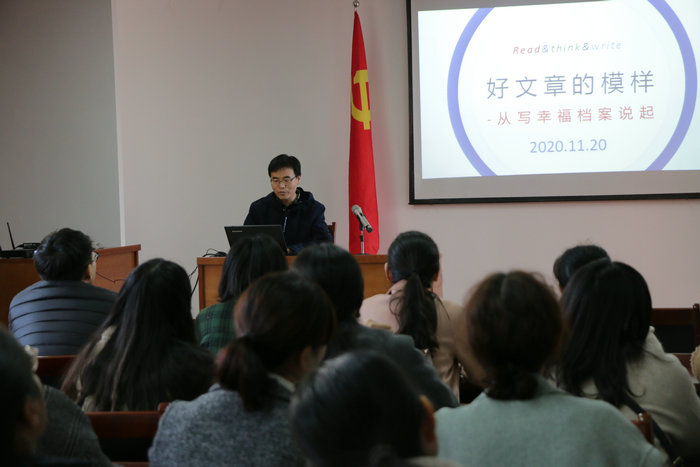 青年教师是学校发展的宝贵财富,青年教师业务素养的提升是学校可持续发展的重要保障。为践行“人文化管理”的教育教学理念,体现学校对青年教师成长共同体的人文关怀,学校于2020年11月20日邀请张相林老师为青年教师做论文撰写培训,提升青年教师扎根教学实践,积淀教学成果的意识。王玉洁校长、刘强副校长和入职近八年的青年教师参加了本次会议。