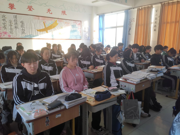 课堂上,老师列举了高三学生在压力下可能面临的种种现象,并针对压力产生的原因及影响进行了深入浅出的剖析。随后,围绕科学应对高原现象、积极运用心理暗示、平衡备考心态等方面给予学生缓解压力的实际指导,并分享了心理调适与压力舒缓的身心放松技巧。宁老师还与学生积极互动,体验渐进式肌肉放松,在老师的指导语和轻松的音乐氛围中,学生感受到了肌肉由紧绷到放松的舒适状态。