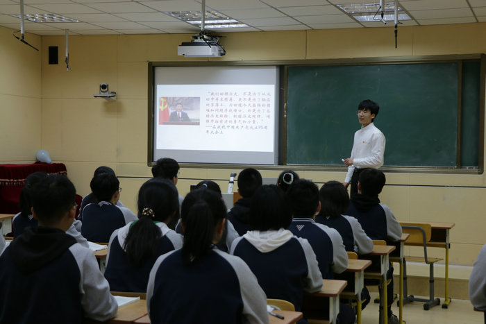 为纪念党的百年华诞,推进党史学习教育在广大师生中走深走实,4月19日上午,我校青年思政教师杨森老师利用升旗仪式后的班会课,以空中课堂的形式为学校师生讲授了一节题为“从毛泽东诗词看中国共产党的奋斗历程”的党史课。学校第三党支部的部分党员教师现场列席旁听。
