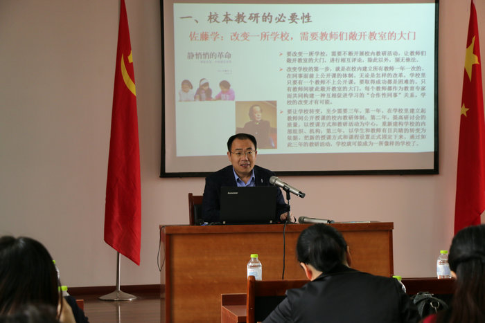 最后是专家讲座。活动特邀山东省特级教师、齐鲁名师、青岛市数学教研员李现勇老师做了《基于“三新”背景下校本教研实践与思考》的专题报告,他引用佐藤学名言“要改变一所学校,需要教师们敞开教室的大门”指出校本教研的必要性。他建议需要健全校本教研制度,开展经常性校本教研活动,充分发挥教研组、年级组、备课组在研究学生学习、优化作业设计、解决教学问题等方面的作用。他强调要形成常态化教研共同体,人人是主角、周周有活动、次次真研究,大力推进教学改革,使课堂教学利于学生获得“四基”,提升“四能”,发展学生核心素养。他指出教学研究是保证,习题资料是生命,课堂教学是手段,再通过测评考试来保证,管理陪伴来催化,以实现提升素养目的。